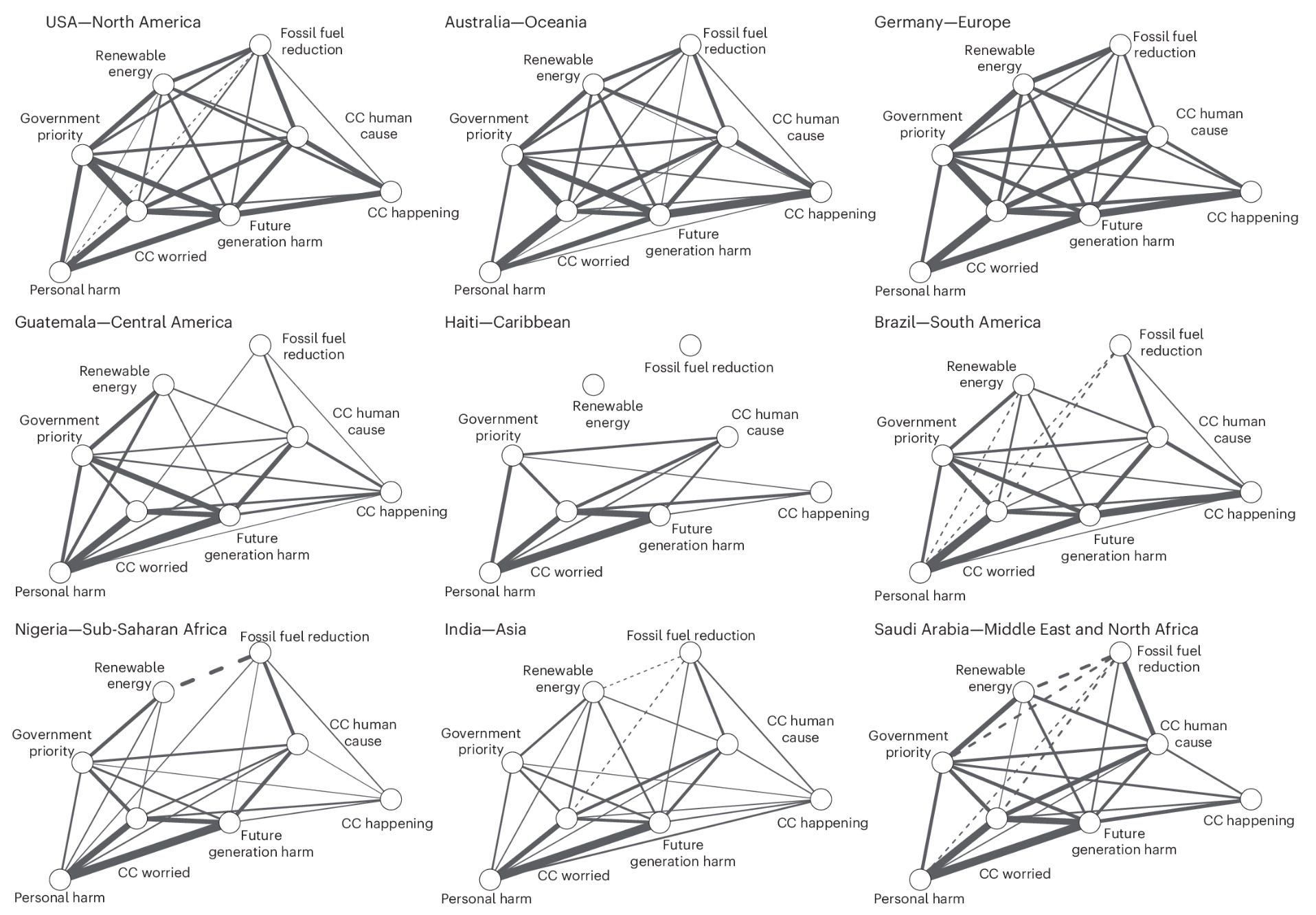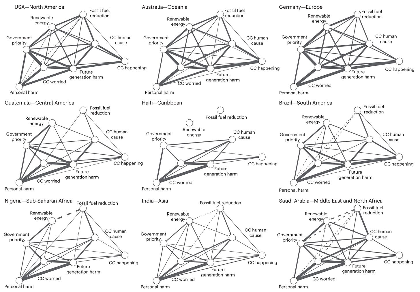 Then discuss/model/argue the localized spectrum: There’s nothing like an argument to encourage people to become familiar with factual information. But an argument does not have to be combative: modeling more sustainable behaviors (e.g., bicycling to the local coffee shop instead of driving a car there) makes an argument all its own. In situations where modeling may not make sense (including online communities), arguing the “more or less” spectrum can help everyone (you, too!) clarify and articulate the dilemmas people face in working to address sustainability challenges together. For example, researchers recently reported a negative correlation in the U.S.A. between “personal harm” and “fossil fuel reduction” (shown by a dashed line in the graphic below, top left diagram). That, in turn, “create[s] challenges due to potential resistance to interventions” such as requiring higher fuel-efficient cars. In other words, many people in the U.S.A. recognize the importance of prioritizing climate policies but they still resist fossil-fuel-reduction interventions because it threatens their economic stability.