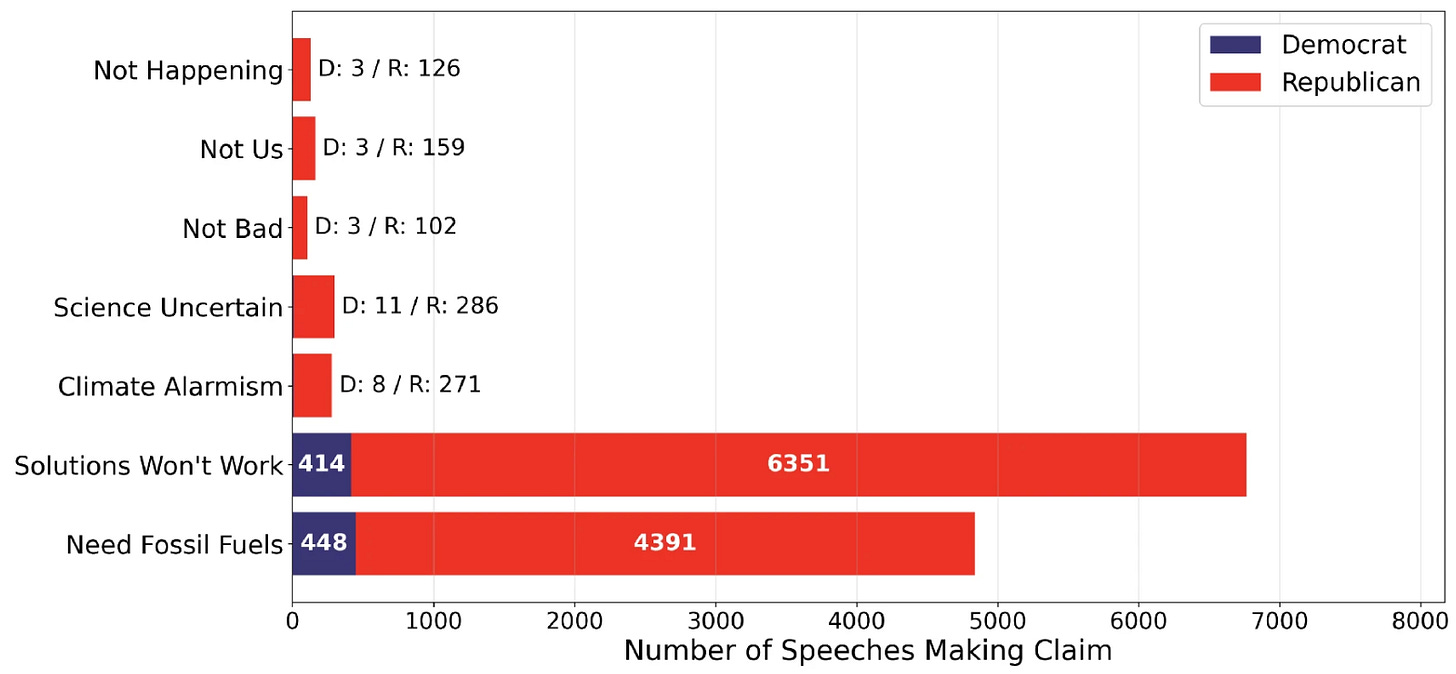 In the research paper, “Large language model reveals an increase in climate contrarian speech in the United States Congress” (Communications Sustainability, 27 February 2026), the authors used publicly available tools to extract the text from the digitized public record of congressional speeches. They then used large language models—a type of A.I.—to separate climate-related vs. non-climate related paragraphs, finding 110,837 paragraphs out of 2,515,806 paragraphs spoken over the 20-year period. They then categorized the rhetorical statements being used against addressing climate change.