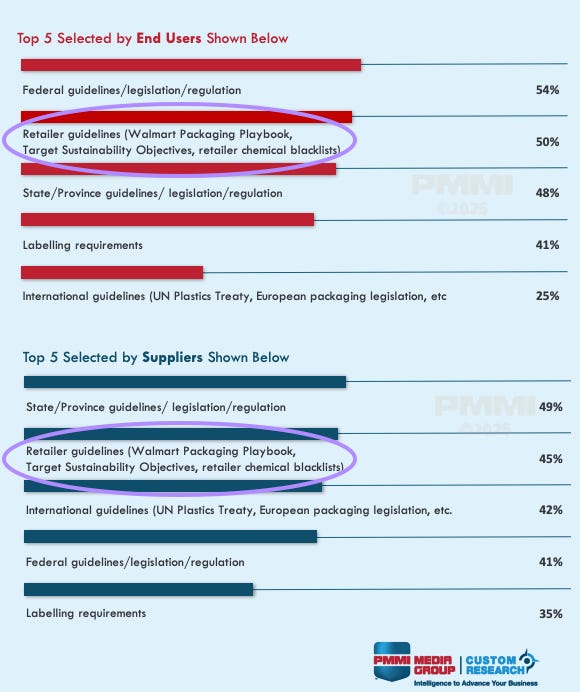 Walmart can drive sustainability globally particularly because its number of suppliers has grown over the past 20 years from the “60,000-plus” suppliers that Scott referenced in his 2005 speech to “over 100,000” businesses today, according to the company’s website. And every one of those businesses supplying Walmart is expected to follow, for example, Walmart’s Packaging Playbook. Those guidelines, along with guidelines of other large retailers, are as influential on the packaging industry as state and federal guidelines/legislation/regulation according to a recent survey conducted by The Association for Packaging and Processing Technologies.